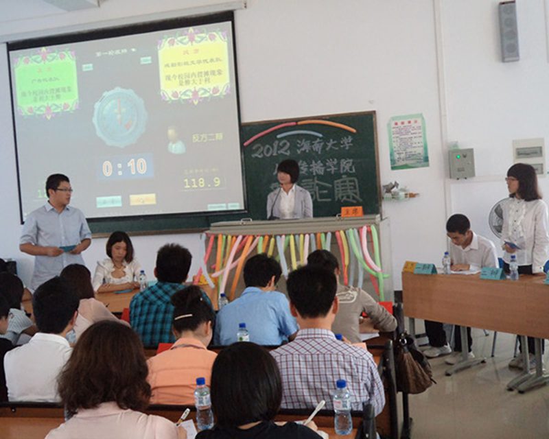 2012年海南大学人文传播学院辩论赛决赛于3月17号下午三点在4教209精彩上演。此次辩论赛由人文传播学院团委学生会主办,人文传播学院资深辩手周凤婷、邱悦颖、姜天渭,以及经济管理学院资深辩手胡宪、梁文婷应邀作为比赛评委。人文传播学院团委书记谢庚全老师和学工办熊文军老师作为嘉宾出席了本次比赛。