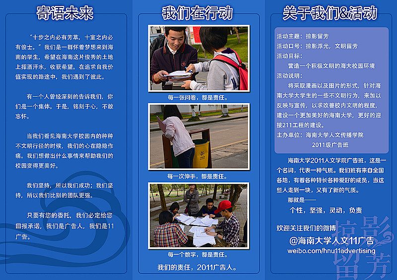 为进一步丰富校园文化生活,积极迎接 我校“211工程”建设评估,海南大学人文传播学院2011级广告班于2012年3月底至4月初举办了“掠影留芳”主题文明活动。本次活动以“掠影留芳”为主题,以“掠影浮光,文明流芳”为口号。活动通过影像、漫画形式,借助于新浪微博、人人网、腾讯网等网络媒介,展露我校大学生校园生活中的一些不文明行为,呼吁“建设文明校园,从你我做起”,旨在提我校大学生校内文明程度。 此次活动的开展得到了人文传播学院广告系系主任毕研韬老师以及学院其他老师的热情支持与指点。在老师们的鼓励支持下,2011级广告学专业的同学们大胆创新,通过调查、采访、文明宣传等方式扩大活动影响范围。为了使本次活动更好地开展,2011级广告班率先在新浪微博开通了班级微博,并设计了班徽、活动标志、班级口号。之后班级成立了秘书、策划、创意、网络营销、公关五个小组,此外设活动组长一名,机动人员两名,并确定小组负责人,明确各组职责。秘书小组主要负责全班的工作协调事宜,策划小组负责前期策划,创意小组负责内容设计,网络营销小组负责网络宣传,公关小组则负责宣传联络等。策划小组策划活动主题及基本活动的流程、策略,同时制作了调查问卷(包括网络版和打印版)。然后在全校范围紧锣密鼓地开展500份的问卷调查,同时在网上开展调查。在严密的分工协同工作下,同学们对问卷进行汇总写出调查分析,同时对数据进行图表化处理,在新浪微博等网络平台上发布了调查情况。调查显示,在校园各类不文明行为中,图书馆占座现象,食堂插队不文明现象最为突出。针对所获得第一手调查资料,2011级广告班的同学们针对这两个现象分别进行了活动策划。 同学们对图书馆进行实地考察,并对占位现象进行拍照,由网络营销小组通过多种网络媒介进行曝光,呼吁全校师生共同关注。公关小组则对图书馆负责人进行采访并与其协商,在图书馆前做活动,扩大宣传效果。对于学生的食堂不文明行为,首先对其进行拍照取样,对学校老师、食堂工作人员进行采访,在网络上进行宣传;并制作了明信片、贺卡等送于老师并邀请其号召同学们文明用餐。经过几天同学们的努力宣传,本次活动收到了一定的效果,图书馆占座、乱丢垃圾的行为明显减少了,食堂里插队、不收餐具的现象没那么严重了,同学们去上课时随手丢垃圾,赶时间时踩踏草坪的现象也减少了。 虽然校园内不文明现象仍然存在,虽然一个班级的力量是渺小的,但“星星之火,可以燎原”,通过对身边人一点一滴的影响,让文明行为从身边人传递开去,文明之风就会遍及整个海大校园。这是2011级广告班同学在活动中共同坚守的一个信念。海南大学人文传播学院2011级广告班,这是一个名词,带着梦想、载着希望,49个有着各种特长各种爱好的成员,这些自认为天才的小家伙走到一块,便有了一种独特的气质,那就是——个性、坚强、灵动、负责。他们挖掘着自己的专业潜力,大胆拓展校园文明活动的策划能力和执行能力。他们立足学校,做属于大学生的活动,突显人文传播学院的人文气息和人文关怀。 在活动中,人文传播学院2011级广告班的同学们以切实的行动展现着自己的风采,为迎接我校“211工程”建设评估和当下我校开展的“校园文明大行动”贡献着自己的一份力量。同时也让我们看到了一个文明团结、欣欣向荣的班集体。