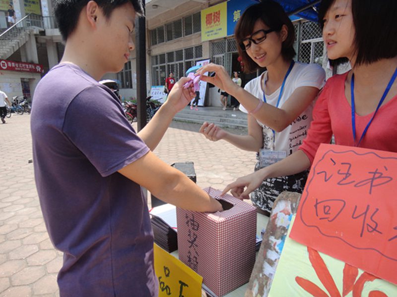 文明大行动“文明环境创建月”。在此背景下,海南大学人文传播学院团委学生会面向海南大学全体学生于4月21至24日四天在人流量高的二食堂门口开展了一次证书外壳有效回收活动。 本次证书壳回收活动以收取同学们不需要的荣誉证书外壳为主,活动中还设置了礼品赠送环节和抽奖环节,广大同学们积极参与,为文明大行动贡献力量。