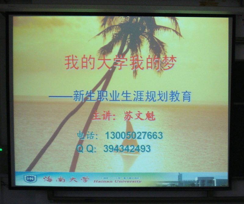 10月15日下午4:50,由人文传播学院举办的2012级新生职业指导活动月在3教310隆重举行,邀请到海南大学就业指导中心副主任苏文魁副教授担任开讲嘉宾,苏老师为同学做了题为“我的大学我的梦”的专场讲座。 讲座伊始,苏文魁老师向参加讲座的同学提出了“我是谁”、“我要成为谁”等一系列引人思考的问题,促使同学立足现实,认清自己。在讲座当中苏文魁老师将大学比作了舞台、清泉等具体的形象,为同学们阐明了大学的真谛以及生涯规划的重要性与意义。在帮助同学们对人生道路规划树立信心后,苏老师又将职业生涯进行了详细的划分,并对生涯时期进行了步骤指导,帮助同学们理清思路,具有实际指导意义。同时,苏老师在讲座中为同学们摆正了职业方向,提供了自我管理、专业知识等技能的获取途径。在讲座的最后,苏老师向同学们为同学们介绍了海南大学就业指导中心的基本情况,并表示如果同学们在需要获得生涯规划的进一步辅导,都可以到学校就业指导中心寻求帮助,他本人也非常愿意为同学们提供帮助,解决问题,现场同学用热烈的掌声表示了对苏老师的感谢。 讲座过程中,掌声笑声不断,苏文魁老师深入浅出,带领同学们探求职业生涯。通过本次讲座,同学们加深了对职业生涯的理解,理清了大学生活的规划方向。