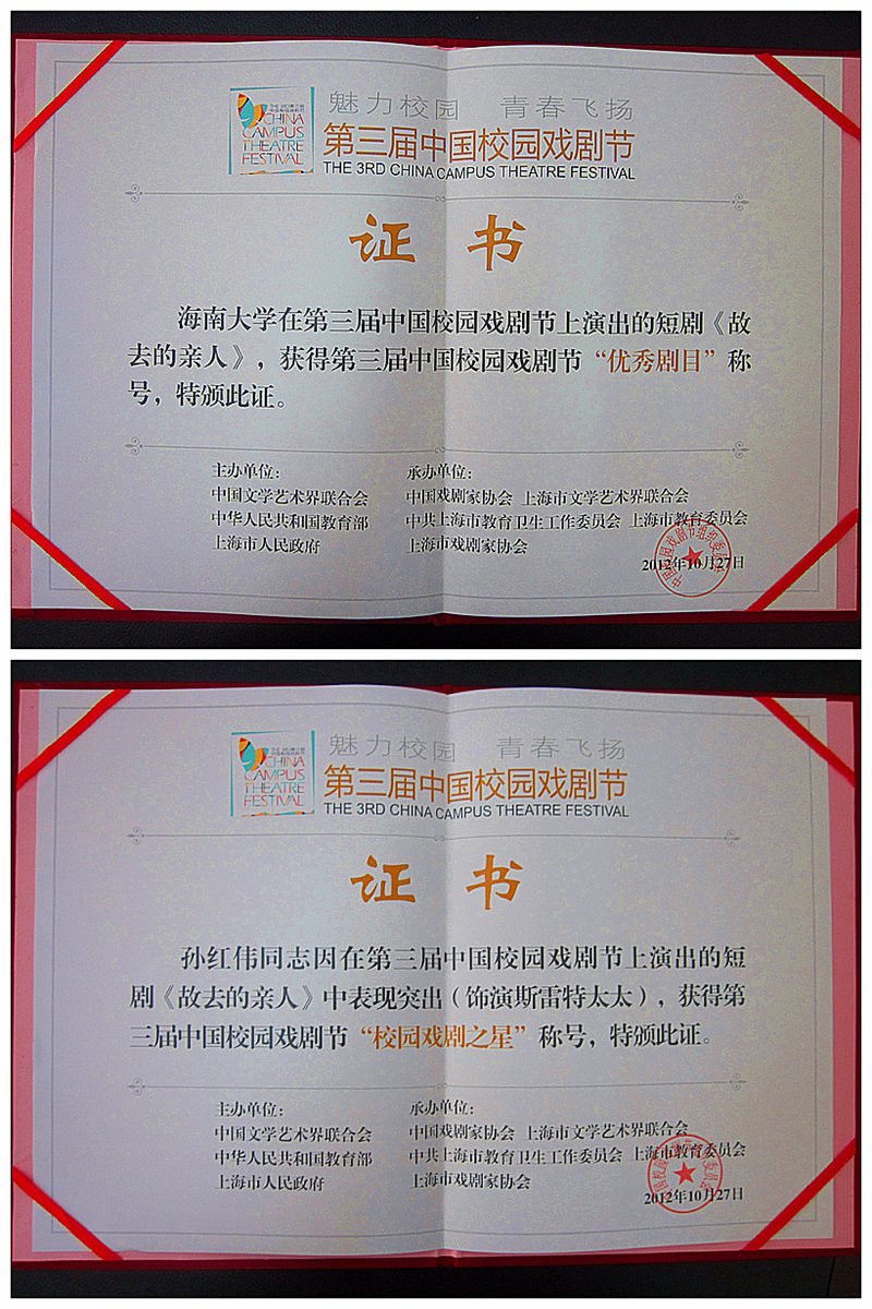 由中国文学艺术界联合会、中华人民共和国教育部、上海市人民政府主办的第三届中国校园戏剧节于2012年10月19日在上海戏剧学院拉开帷幕。本届校园戏剧节以“魅力校园-青春飞扬”为主题,经过19日至27日为期九天的大赛角逐,由我校人文传播学院“海棠剧社”剧组选送的参赛的剧目《故去的亲人》分别斩获本届戏剧节“优秀剧目”奖,“优秀组织”奖和“校园戏剧之星”三项大奖,为我校争得殊荣。 此次“海棠剧社”剧组赴上海参加本届中国校园戏剧节,由lol下注