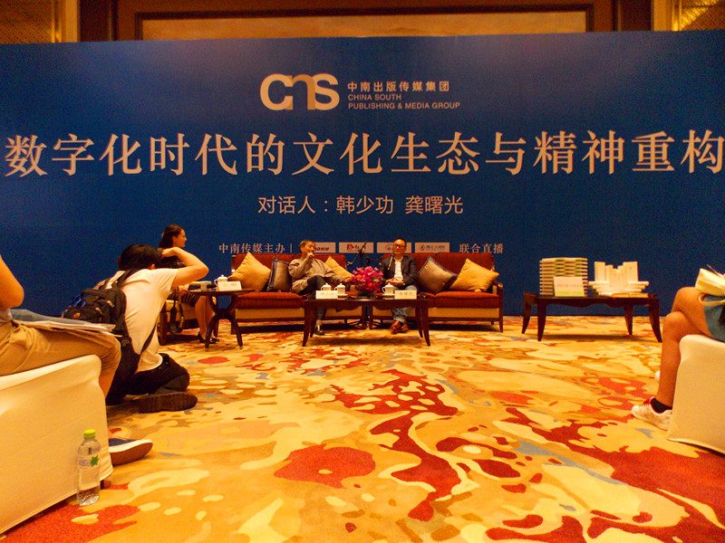 2013年4月19日下午,著名作家韩少功和资深出版人、中南传媒集团董事长龚曙光于海口香格里拉大酒店进行主题对话。两人以数字化时代的文化生态与精神重构为话题,围绕互联网和数字化生活对现代人生活情感所产生的颠覆性影响,以及在这种影响下如何重构精神家园展开了深入的交谈。人文传播学院组织2012级研究生和部分本科生参与了此次对谈,在提问互动环节并与韩少功、龚曙光两位对谈者展开了深入交流。