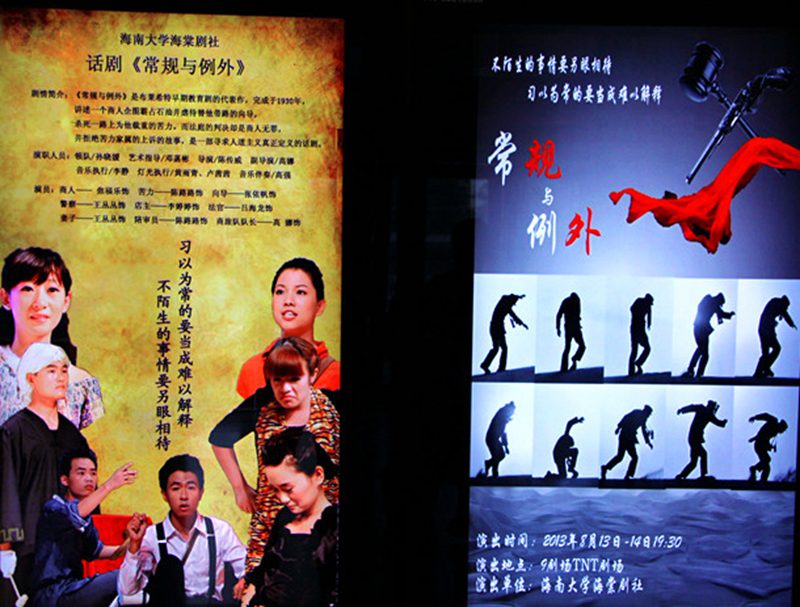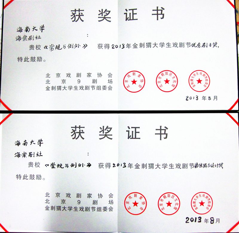 8月18日,由北京戏剧家协会、北京9剧场联合主办的“2013金刺猬大学生戏剧节”在北京9剧场举行了剧目讨论会暨颁奖仪式。12部来自全国高校的戏剧作品,经过为期15天的演出角逐之后,所有奖项最终尘埃落定。海南大学海棠剧社参演剧目《常规与例外》喜获本届金刺猬大学生戏剧节“最佳舞台设计奖”和“优秀剧目奖”,再次为我校争得殊荣。这些成绩的取得与学校党委陈封椿副书记、教务处、学生处以及学院领导的关怀、支持和帮助是分不开的。 海棠剧社《常规与例外》剧组于2013年8月10日在人文传播学院党委孙晓媛副书记和剧组指导教师邓菡彬老师的带领下应邀赴京参赛,冲击本届金刺猬大学生戏剧节奖项。《常规与例外》改编自德国戏剧大师布莱希特的经典作品,讲述一个商人企图霸占石油并虐待替他带路的向导,杀死一路上为他载重并好心给他水喝的苦力。苦力的妻子和商人对簿法庭,而法庭的判决却是商人无罪,并冠冕堂皇的拒绝苦力家属的上诉的故事。在人文传播学院邓菡彬老师指导下,该剧由2011戏剧影视文学专业学生陈传威执导,参赛演员及幕后均是2012级戏剧影视文学大一学生。 在比赛演出后的演后谈环节,大赛组委会评审专家充分肯定了我校大学生对经典戏剧勇于挑战的精神,对剧组解读布莱希特大师的方式也表示认同并提出成熟宝贵的意见 。演出的成功赢得了观众与评委的一致好评,最终摘得本届大戏节“最佳舞台设计奖”和“优秀剧目奖”。在京期间,中央人民广播电台和教育部主管、大学生体育协会主办的《阳光体育—新跃》杂志还对剧组师生进行了专访。 金刺猬大学生戏剧节创办12年来,以“热情、鲜明、纯粹”的形象,吸引着来自全国各地大学生戏剧爱好者,影响力辐射全国400余所高校。本届比赛共有包括中国传媒大学、中国戏曲学院、中国农业大学、中南大学、四川大学等20个省市的65所高校报名参加,我校海棠剧社《常规与例外》等12部戏剧作品作为优胜剧目入围终审。 海棠剧社是海南大学新生并成长迅速的学生社团,2006年荣获优秀社团称号,2007年获得“十佳社团”殊荣。剧社自创立以来,在经费不足、缺乏专业指导等困难的条件下,本着“服务同学,繁荣校园文化”的宗旨,不断进步,不断成长,致力于丰富海大学生的精神文化生活和繁荣海大的校园文化。剧社近年来也得到学校领导的关心和支持,2012年剧社凭《故去的亲人》在上海校园戏剧节取得佳绩,本次赴京参赛再创佳绩都与海南大学校领导和人文传播学院领导的关心和支持分不开的。剧社师生也将更加努力,争取取得更大更优的成绩。
