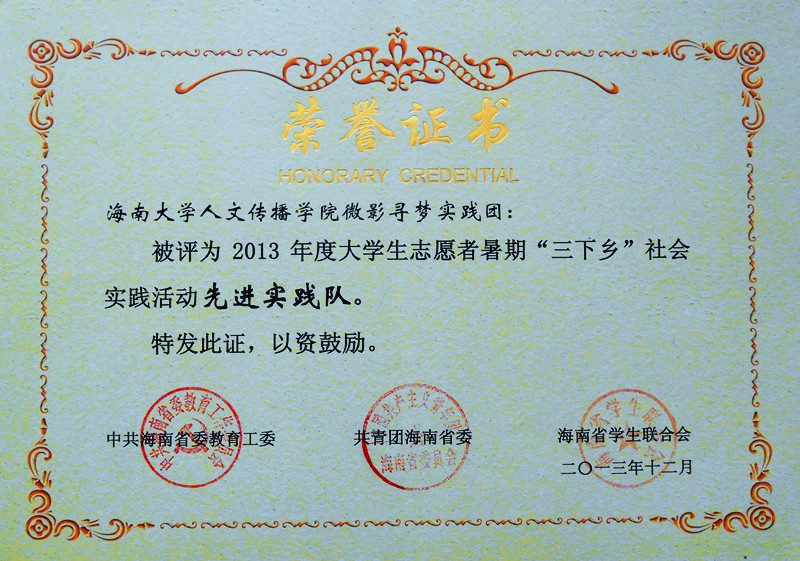 以2012级广告学专业陈伟兴同学为队长的“微影寻梦”实践团队荣获海南省2013年度大学生志愿者暑期“三下乡”社会实践活动先进队荣誉称号,2011级广告学专业毛占潇、谢琳、王曦三位同学撰写的暑期社会实践论文《关于海南省旅游形象的调查研究》获得了海南省 2013 年度大学生志愿者暑期“三下乡”社会实践活动优秀调查报告(论文)二等奖,2010级戏影专业宋子琛同学被评为海南省 2013 年度大学生志愿者暑期“三下乡”社会实践学生积极分子。 “微影寻梦”实践队于7月2日—8月24日间赴琼中摄制微电影,以期揭示“琼中女足”的精神风貌。实践队员全部为海南大学人文传播学院学生,导演陈伟兴是广告专业12级学生。陈伟兴的老家在琼中,怀着对家乡的感情,他主动与当地宣传部门和支教团队联系,记录这段发生在琼中感人的寻梦故事。故事的主人公是荣2012年度全国十大“最美乡村教师”称号的肖山老师,实践队以微电影的方式记录了琼中女足的寻梦历程。 《关于海南省旅游形象的调查研究》主要探讨了海南省如今的传播形象是否与其本体形象相对应;游客以及本土居民对旅游岛本身的感知形象有怎样的认识;通过相关调查研究找出海南国际旅游岛现阶段存在的问题,并提出相应的解决方案。三位同学在调查过程中深入海口及三亚各地派发调查问卷及采访相关人员,找出了海南国际旅游岛发展现状。 根据海南大学校团委《关于开展2013年大学生志愿者暑期“三下乡”社会实践活动的通知》要求,围绕“践行见远、宝岛筑梦”的活动主题,lol下注