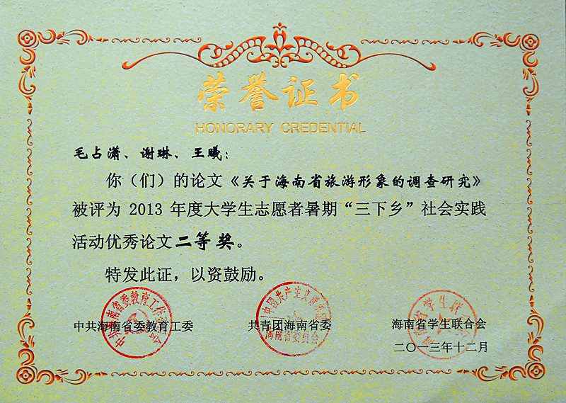 近期,在共青团海南省委下发的《关于表彰海南省 2013 年度大学生志愿者暑期社会实践活动先进集体、先进个人及优秀调查报告(论文)的决定》中,lol下注