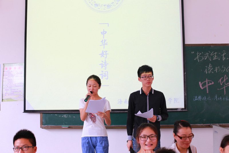 学工办熊文军老师为大赛致辞。他提到:作为文学院的一名学生, 学习传承文化经典是我们义不容辞的责任,而学习诗词歌赋也是培养我们知识素养和人文情怀的有效途径。他希望同学们都能走下网络,通过阅读经典,全面提升我们的文化修养,通过传承经典,让青春更加深厚,做中华优秀文化传播的永恒使者。熊老师的致辞结束后,一场文化大餐正式上演。各位选手思维敏捷,思路清晰明确,知识储备极为丰富。他们在这场文化之战中享受着知识的快乐,展示着一个人文学子应有的风采和魅力。破阵子,少年游,丑奴儿,六州歌头,望江南,苏幕遮,雨霖铃,烛影摇红。一首首,一句句,在场的每一个人无不为中华诗词的魅力所深深的吸引。激烈的比拼,文化的碰撞也引领着各位观众投入其中。比赛现场,文化氛围浓厚,现场气氛热烈活泼。 汉字永存,国魂常在,中文承载着整个华夏的生命。诗词常咏,陶冶心智,让你我的心灵永远秀美清纯。本次的“中华好诗词”竞赛活动不仅仅是一次展现人文学子魅力与高尚情怀的舞台,更是我们文学学者致敬文化的一种方式。在中华诗词的世界里我们高歌大放,抒万世豪情,祝愿人文学子能在传承中华优秀文化的道路上越走越远!