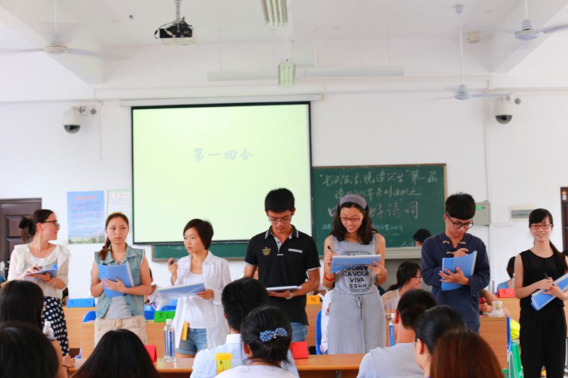 4月27日上午9:00,人文传播学院“书式生活,悦读人生”第一届读书文化节之“中华好诗词”活动在4教203如期举行。本次活动本着增强对传统文化的归属感以及认知度,提高大家不断学习传统文化的兴趣,鼓励学不断提高自身的阅读量及文化修养为主题,特向全院学生开展。最终共有来自全院的9组45位参赛选手参加了比赛,人文传播学院学工办熊文军老师和学生会主席李文杰也出席了本次活动。 本场比赛共分为三个环节进行,经过三个环节的激烈比拼,最终确定本次比赛的冠亚季军并举行颁奖典礼。第一个环节为成语接龙。各小组以抽签决定比赛题目并进行为时三分钟的比赛,在规定时间内以所接成语个数进行计分,一个成语一分。本环节结束后共有两个小组淘汰,七个小组晋级。第二个环节为汉字听写。在本环节中每轮每对派一个人进行比赛,每轮共五题,每题30秒作答时间。最终以累积得分为本环节最后得分,得分在前五名的队伍进入决赛。第三个环节为诗词竞答,本轮的题目多样有含有某种主题的诗句、含有某字的诗句、诗词背诵、选择题等。本环节采取小组合作的方式共十轮,得分排在前三的队伍将成为本次比赛的冠亚季军。 在活动正式开始前lol下注