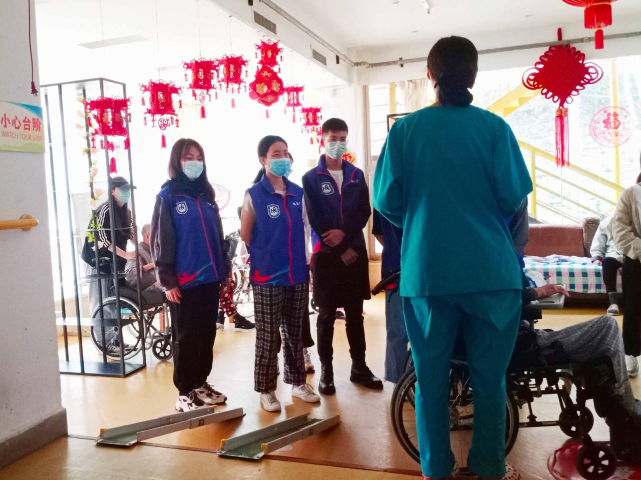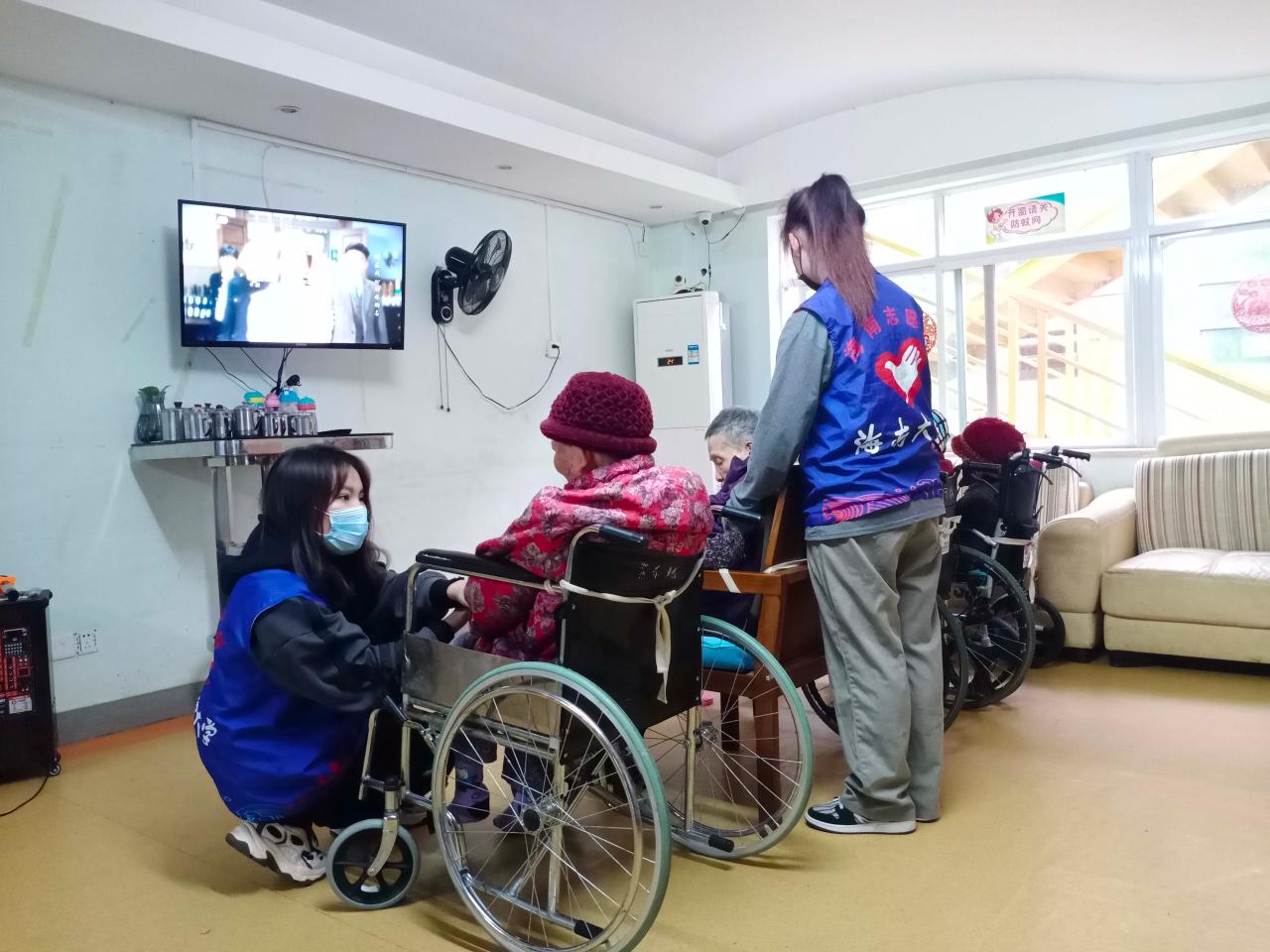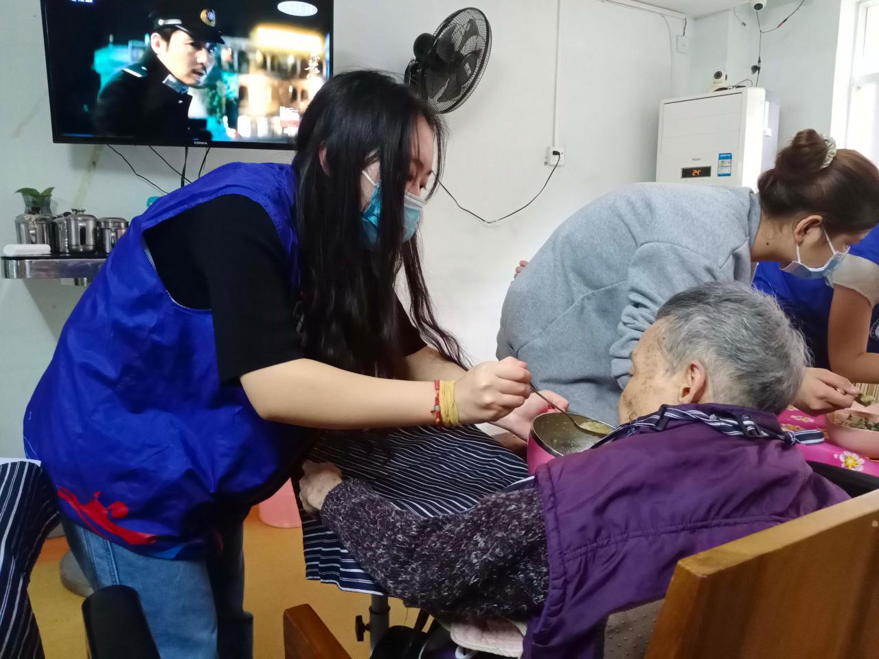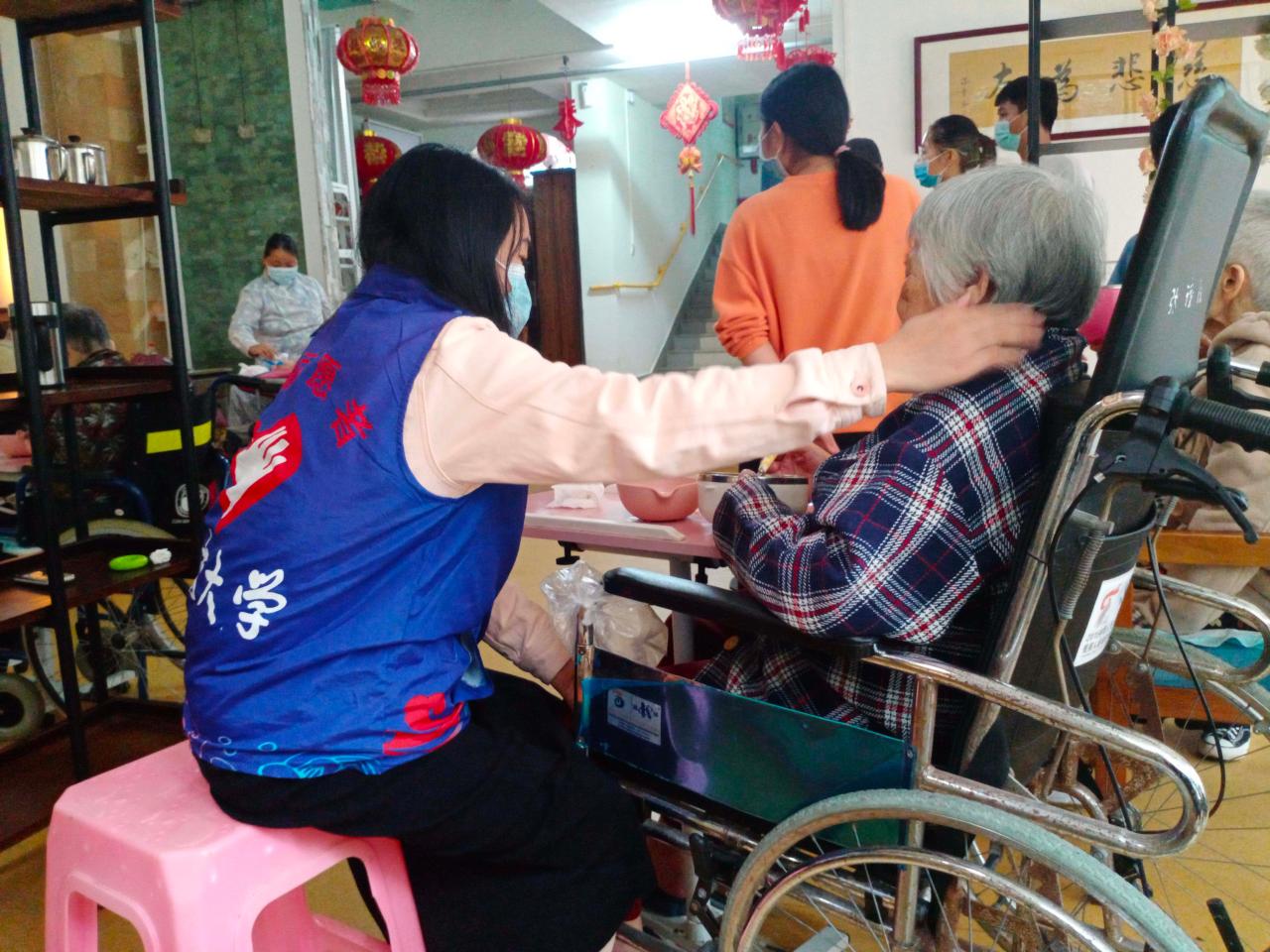 志愿者们同往常一样,在护工人员的指引下出示健康码、进行体温检测、登记相关信息、并全程佩戴口罩,以保证老人们的健康安全。在护工详细地为志愿者讲述完照顾老人的注意事项后,志愿者两两一组,共计三组,分别到不同楼层陪伴老人、照顾老人。有的陪老人说话,逗他们开心;有的为他们按摩,让他们放松。还有一名志愿者在护工人员的带领下,帮助工作人员进行护理院相关资料的整理。活动进行顺利,气氛融洽。