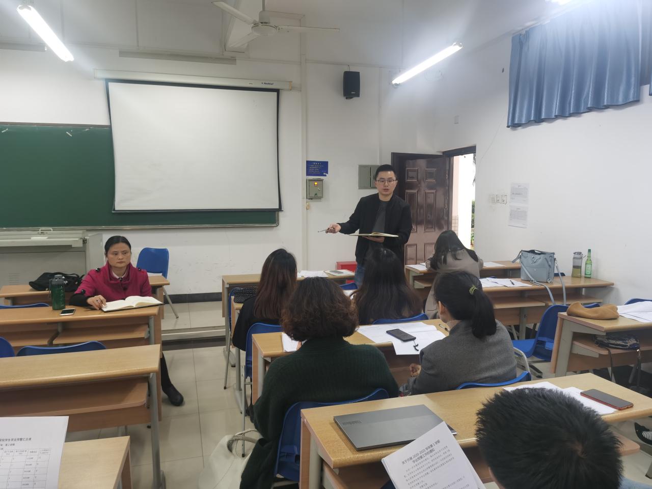 随后,学工办李洁提出了三点问题。第一,她指出在元旦以及寒假期间要切实做好学生安全教育工作、保障校园安全稳定。第二,对于诚信考试问题要召开主题班会。通过让同学们签订诚信考试承诺书,提高同学们的诚信意识,营造公平的考试环境。第三,根据教务处提供的两个学期的成绩,李洁向班主任介绍了学业预警,学业预警分为红、黄、蓝三种,班主任应对过线的学生进行谈话干预。
