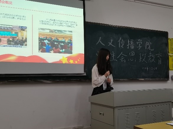 会上,学生会联络部轮值部长肖芯妍首先向我们介绍了2021全国两会,即中华人民共和国第十三届全国人民代表大会第四次会议和中国人民政治协商会议第十三届全国委员会第四次会议,简单说明了会议的地位和意义,强调了本次会议的重要性,加强了我们对会议的认识。接着,又从两会热点即远景目标、民生刚需要、乡村振兴、绿水青山、健康中国、科技创新、制度创新、正风反腐、与世界共处出发,用简单但又准确的语言概括两会的大致内容,从各方面、各角度带领同学们去发现、深入身边真实存在的案例,让同学们感受到,两会离我们其实并不遥远。