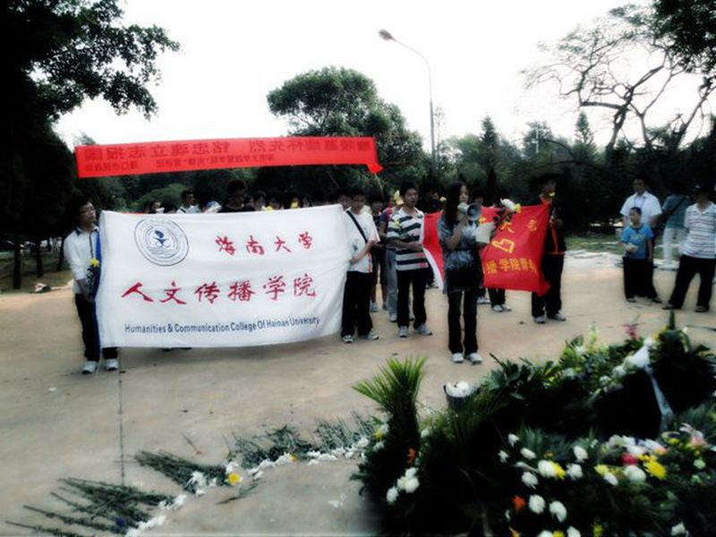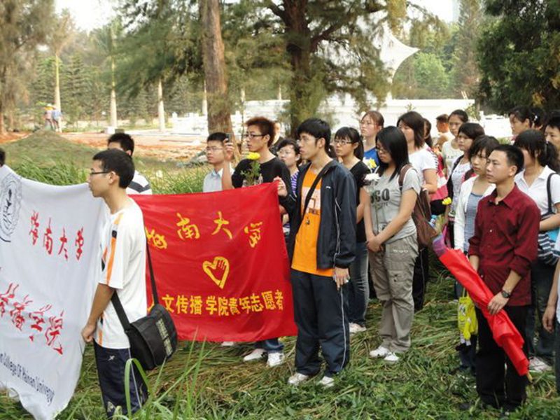 到达陵园后,志愿者团队与学院团委书记谢庚全老师会合,在引导员的带领下,大家怀着崇敬的心情踏入了先烈们的长眠之地。在墓前,听着海南大学先锋宣讲团义务讲解员的讲述,凝视着庄严的墓碑,大家心情沉重,并向逝去的先烈们献花表示哀悼。随后,杜盼盼代表志愿者们致悼词,并带领同学们宣誓,要通过更多的志愿活动为社会做贡献。接着,公老师带领同学们一起清除墓碑周围的杂草和垃圾,大家干的都很认真,虽然很累,手也弄脏了,但都一直坚持着。