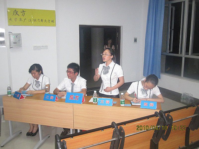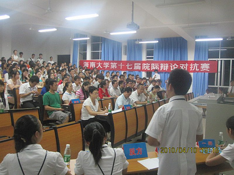 4月10日晚上7点,海南大学第十七届院际辩论赛第二轮在4-107举行,人文传播学院文韬武略辩论队是比赛的反方,辩题为“大学生广泛社交弊大于利”,与正方法学院辩论队一较高下。评委由海南大学文化素质教育办公室主任王冬梅老师、艺术学院党委陈泰义副书记、海南大学学报主编许文深老师、农学院副教授郑继平老师和农学院夏幽泉老师组成。人文传播学院辩论队队员有一辩李禾瑧,二辩霍辉,三辩胡艳秋和四辩杨越。