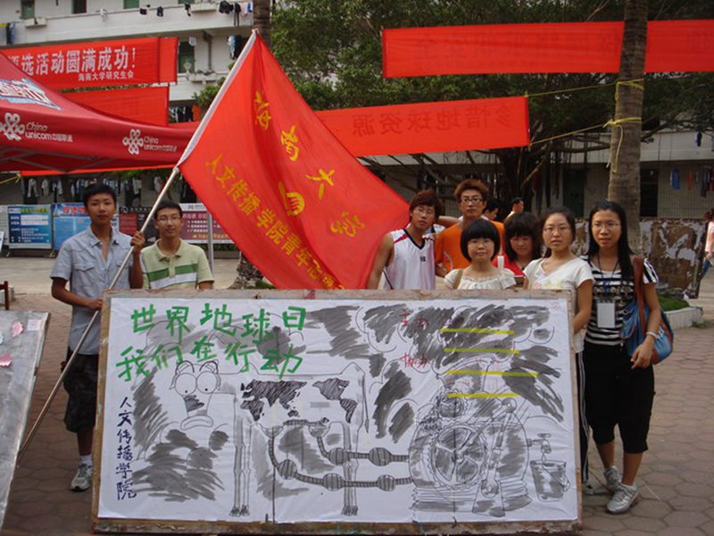 4月22日下午4:30在海南大学第二食堂前开展了以“珍惜地球资源 转变发展方式 倡导低碳生活”和“保护地球、绿色行动、节约合理利用水资源“为主题的第41个“世界地球日”宣传活动。这次活动由海南大学绿岛环境协会和政治与公共管理学院土管系学生倡导并主办,由海南大学学生会、人文传播学院社会实践部、美术协会、书法协会等组织和团体协办,共有两百多人参加此次活动。