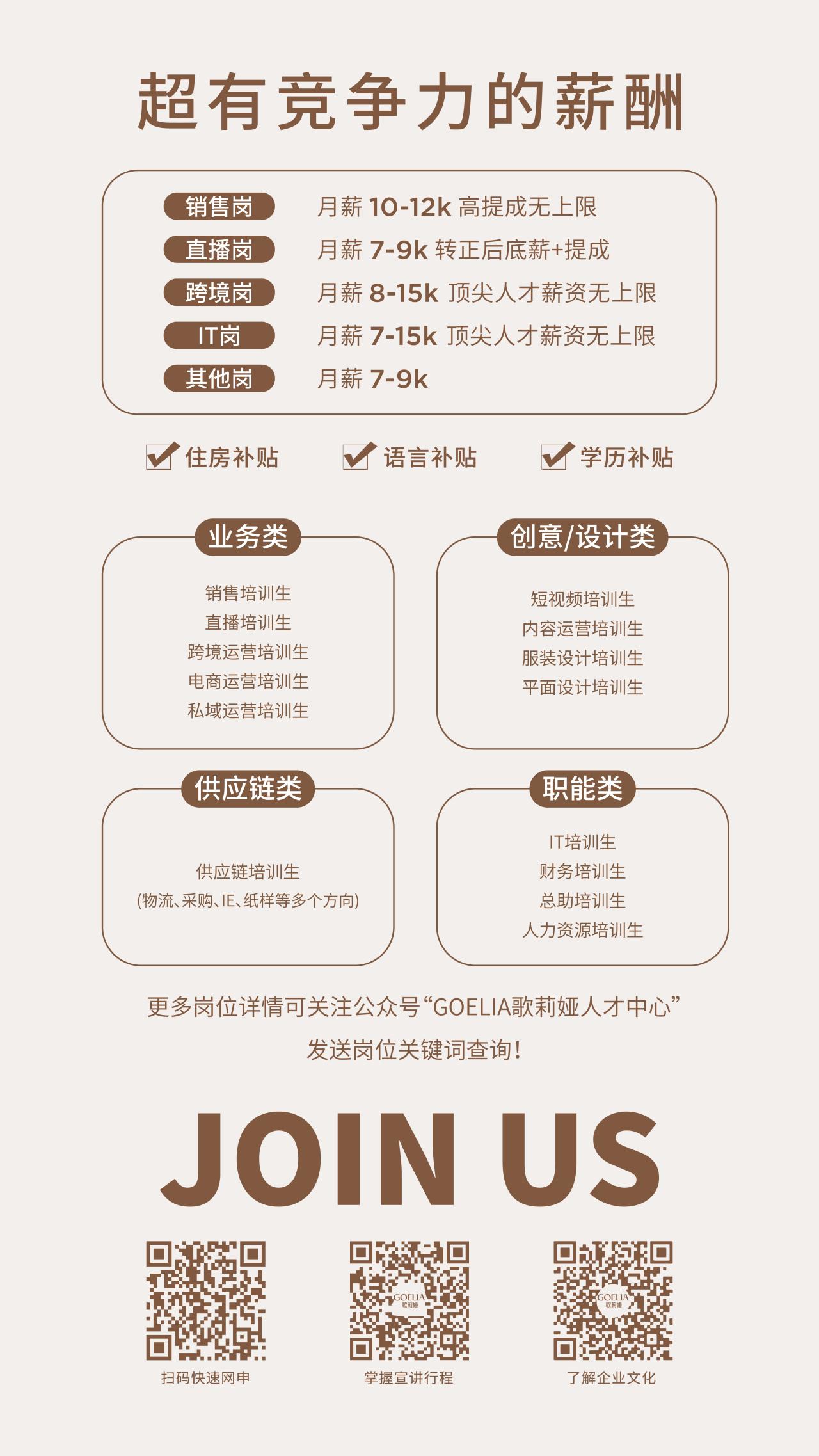 春招岗位:直播培训生(主播/助播/中控)、跨境运营培训生、销售培训生(零售/加盟)、服装设计培训生、图案设计培训生、供应链培训生、电商运营培训生、私域运营培训生、内容运营培训生、平面设计培训生、短视频培训生、IT培训生、财务培训生、人力资源培训生、总助培训生