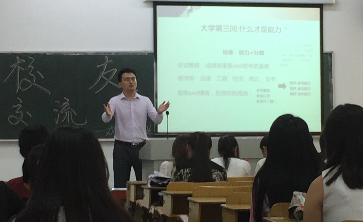 10月25日10:15,人文传播学院2015年新生职业指导活动月系列活动之校友交流会于海南大学城西校区如期举行,2015级汉语言文学专业、广告学专业及传播学专业、戏剧影视文学专业、汉语国际教育专业的400余名同学分别在四间教室与校友进行了深入交流。本次活动由学院学工办公衍峰老师主持,邀请到史小兵、李东绪、俞海军、胡金至、黄艳群等校友参加。