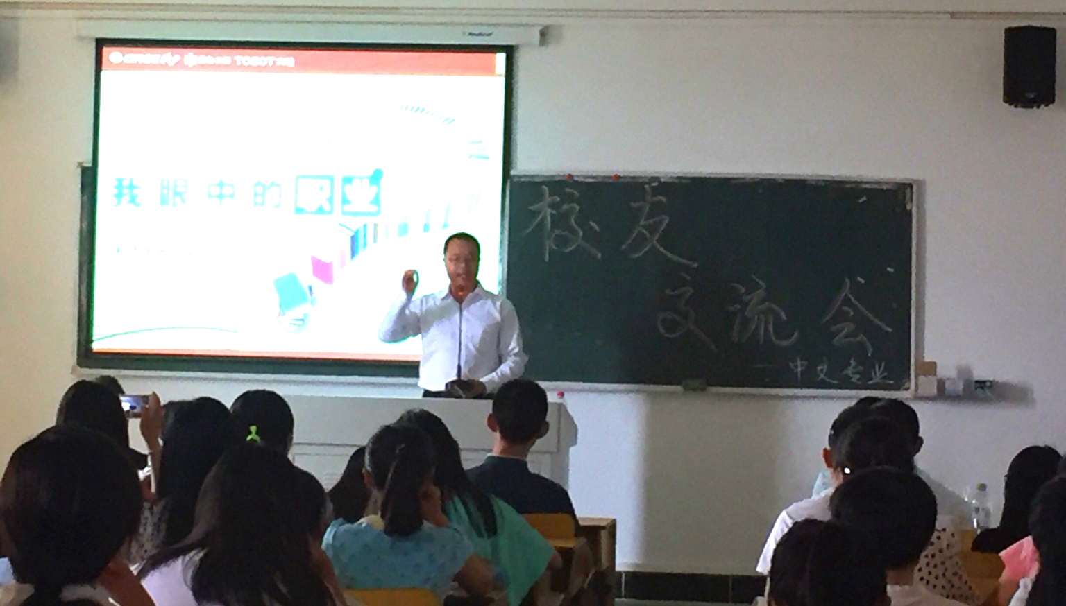 广告学专业的首届毕业生,他首先指出本次交流会的主题“职业指导”,详细分析了当今大学生的就业压力问题,并希望同学们要不断扩大自己的知识面,不要被专业知识所禁锢。戏剧影视文学专业的俞海平现任海航一卡通汇服务集团有限公司人资行政经理,2011年毕业,他在交流会开始时,送给了学弟学妹们八个字“人生如戏,刚刚开始”,他希望学弟学妹们能够在初中、高中、大学三个不同阶段树立不同的目标,把每一个阶段都当成新的开始,朝着目标不断前进,不断提高自己的实践能力。汉语国际教育专业邀请到了胡金至学长和黄艳群学姐,他们认为在大学生活中,同学们应该分清主次问题,不能把大量的课余时间都用来娱乐,而是要以学习为重,学习才是一个学生的本分。