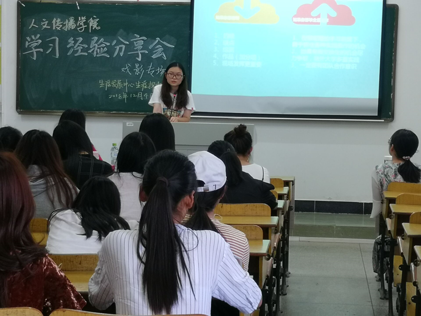 2018级新生刚进入大学校园,还没有完全熟悉和掌握大学的学习方式、方法。经过调查发现,很多新生同学都迫切想知道大学阶段的学习模式,希望通过与优秀的学姐学长进行面对面的交流获取经验,帮助自己尽快适应大学阶段的学习,也期望着能尽早的了解有关考研保研方面的知识,清晰自己的生涯规划,从而更好地融入大学生活中去。2018年12月4日星期二下午3点,生涯发展中心生涯探索部成功举办“学习经验交流会---与优秀学姐的零距离接触”活动,共邀请各专业获得国家奖学金和综合特等奖学金的六名优秀的学姐分别与本专业的同学进行交流。中国语言文学专场邀请到2015级汉语言文学专业的钟梓瑜学姐和2015级汉语国际教育专业的曾腾腾学姐;戏剧影视文学专场邀请到2015级戏剧影视文学专业的赵佳慧学姐和辛亚奇学姐;新闻传播专场邀请到2015级广告学专业的邱艺学姐和2015级传播学专业的陈诗洁学姐。 中国语言文学专场