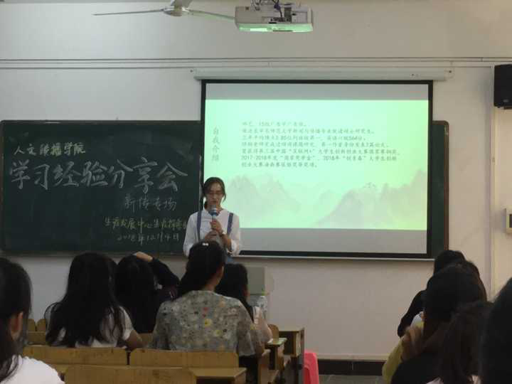在轻快的音乐声中,学习经验分享会中国语言文学专场在同学们的期待中开始了,我们邀请到了2015级两位获得综合特等奖学金的学姐:钟梓瑜学姐以及曾腾腾学姐,她们分别被推免至重庆大学和北京师范大学继续攻读研究生。钟梓瑜学姐作为第一个上台分享的学姐,还未开讲,条理清晰的PPT分享内容纲要已经让同学们赞叹不已,之后学姐为同学们讲述了大学的学习方法与思路,同学们积极汲取营养,认真听讲。接下来为同学们分享经验的是曾腾腾学姐,她以时间顺序作为介绍思路,在她的讲述中同学们了解到了学姐的大学规划与经验得失,丰富多彩的学习以及课外实践,而其中的交换生项目更是让同学们对于大学生活充满了期待与激情。随后进入了同学们期待已久的自由问答环节,同学们一改往日的沉默,纷纷举手向学姐提出自己的困惑,问题都是与专业学习息息相关的,比如“关于汉教和中文在专业学习和就业方向上的区别”、“关于大学英语以及文学史学习方法的探讨”等等,在这些提问中同学们能够精准了解自己想知道的内容,互动氛围融洽而活跃。