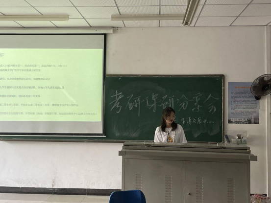 最后一位进行分享的是戏剧影视文学专业的于璐学姐。于璐学姐如今已经进入剧组有了工作经验,因此在此次分享过程中特别强调了知识多样性的作用。学姐告诉我们,在保研面试的时候,许多老师问的问题并不拘泥于课本,而在实践中也同样需要用到多样化的知识。她希望我们不要只关注专业课的知识,而是全面发展,成为更好的自己。