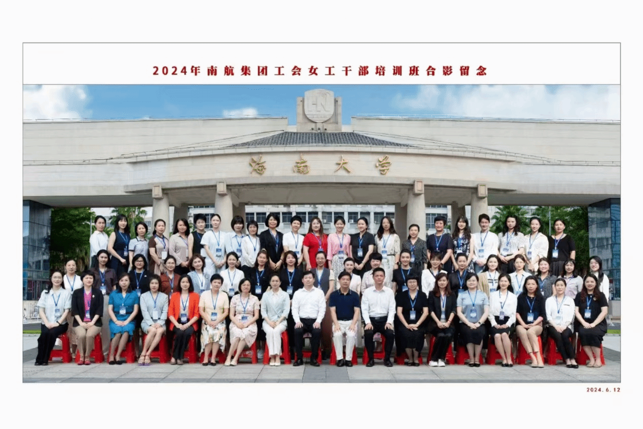 2024年6月12—14日,由南航集团工会主办,海南分公司工会承办的2024年南航集团工会女工干部培训班在海南大学开班,来自各单位的54位女职工干部参训。海南分公司总经理彭聚珍,党委书记刘津,集团公司群团工作部副部长、集团工会女职委主任、团委书记彭珺参加开班仪式。